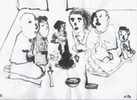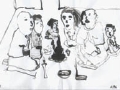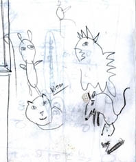 一人が描いた絵をみて、次の人がそこから連想するものを描いていく行為を何度も続けました。